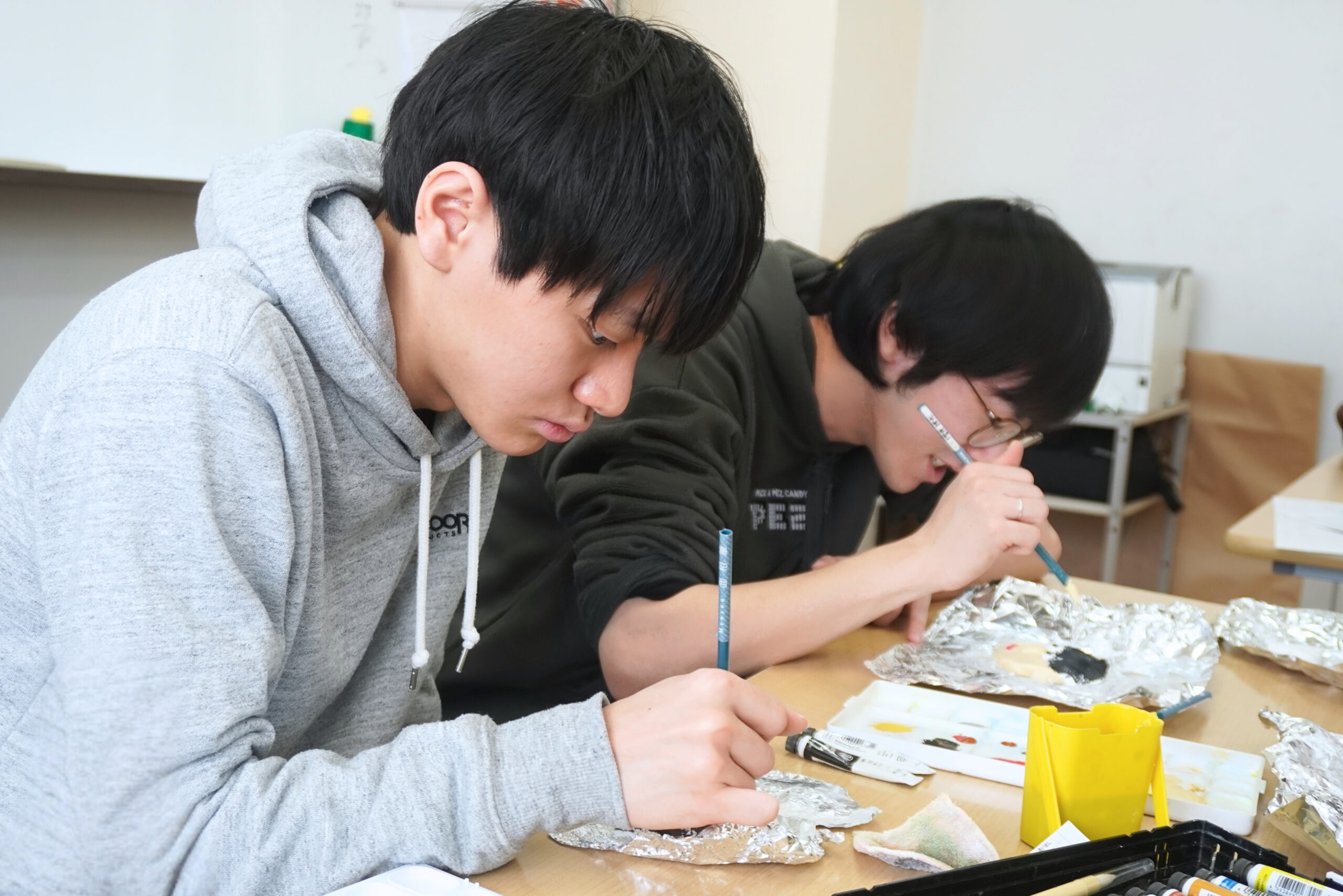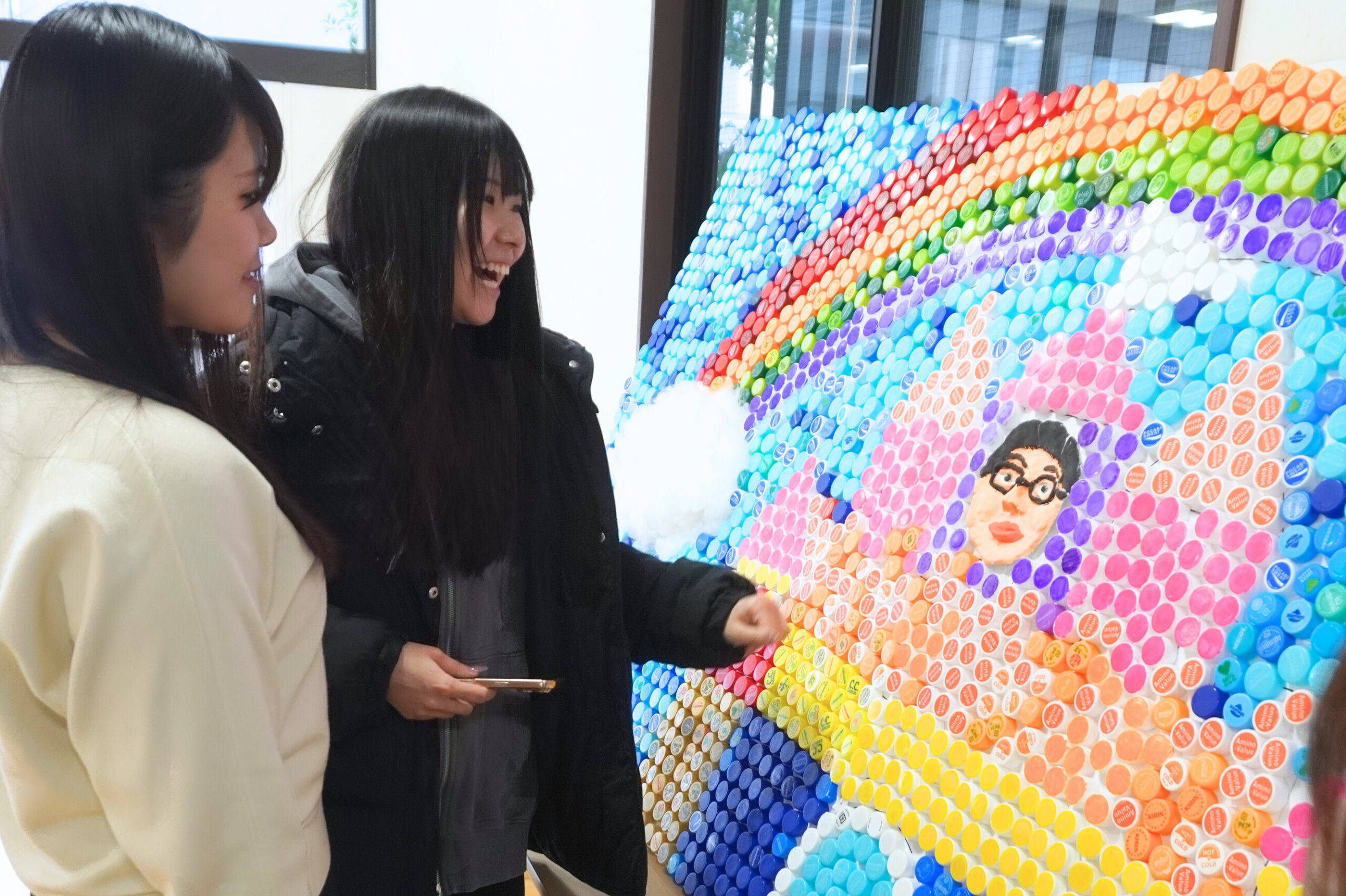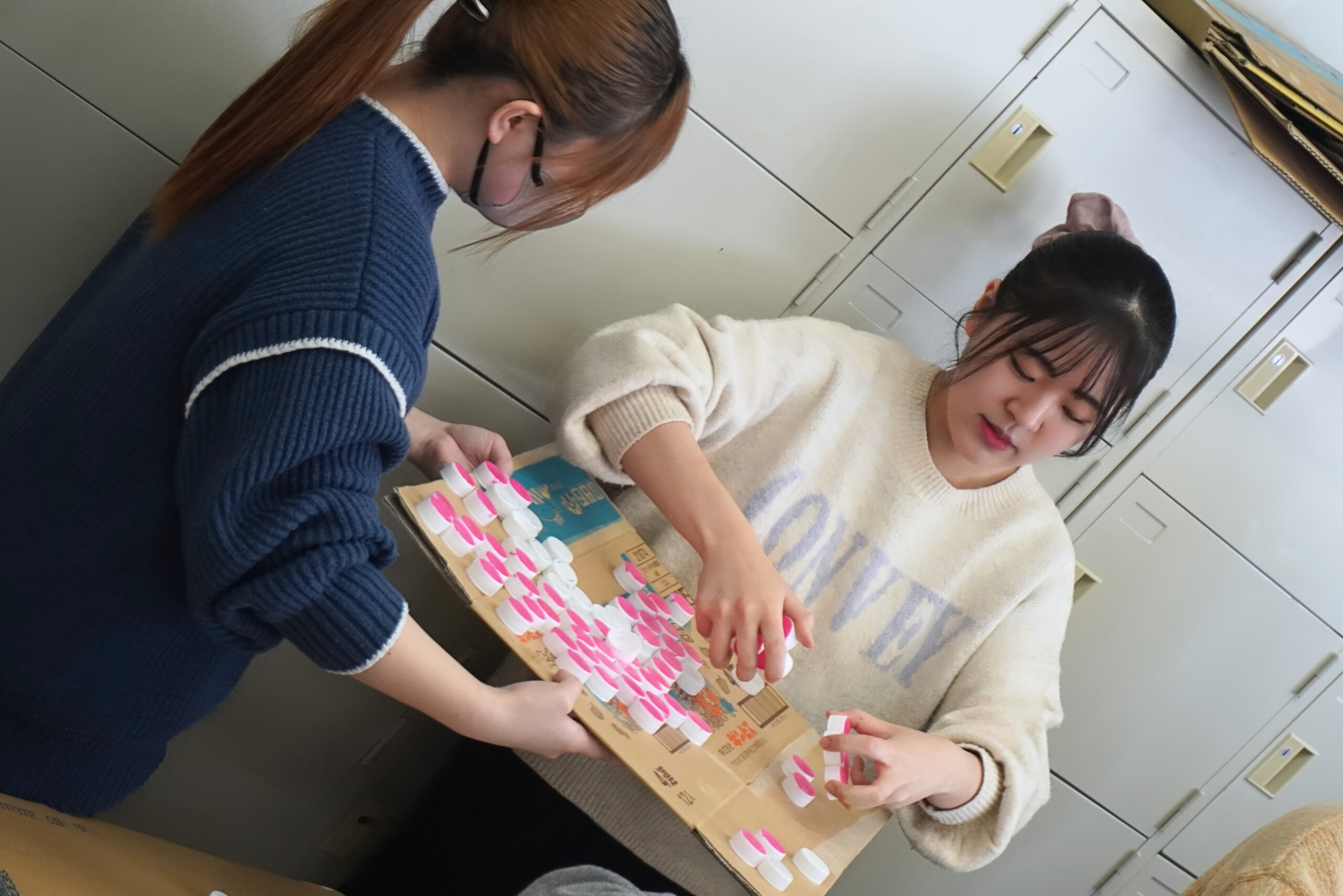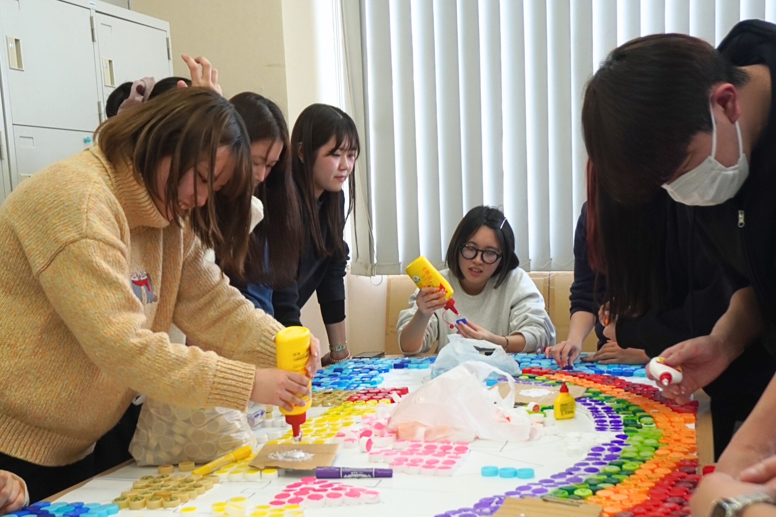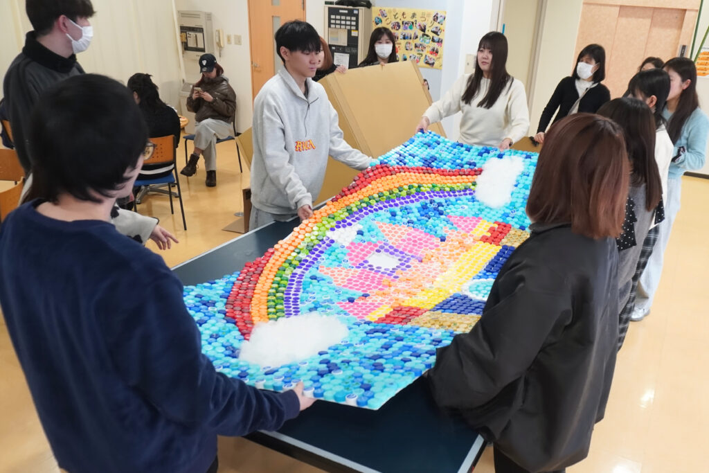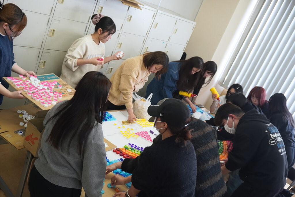 計画を立てる人、キャップを集める人、図柄を考える人など、学生達はそれぞれ役割を担い、製作を進めます。
