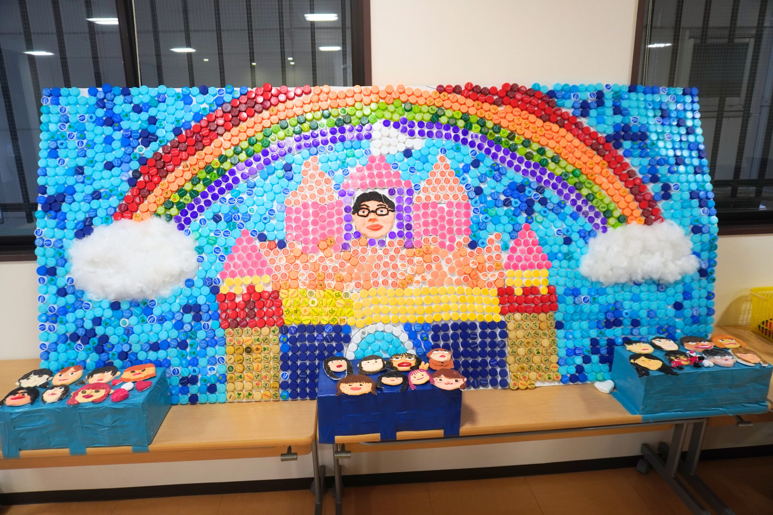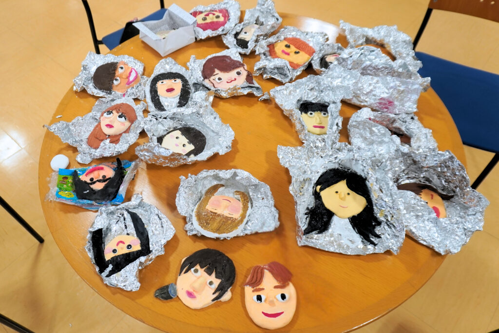 ペットボトルキャップのオブジェと一緒に、紙粘土でクラスメイト(+担任の先生)の顔も製作💪