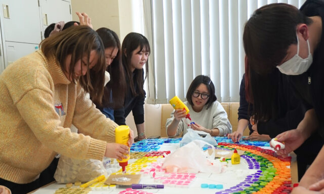 “子どもの人と関わる力を育む保育”を学ぶ「人間関係」の授業で、“卒園製作”をロールプレイ。ペットボトルキャップを使ったオブジェを作りました!