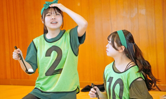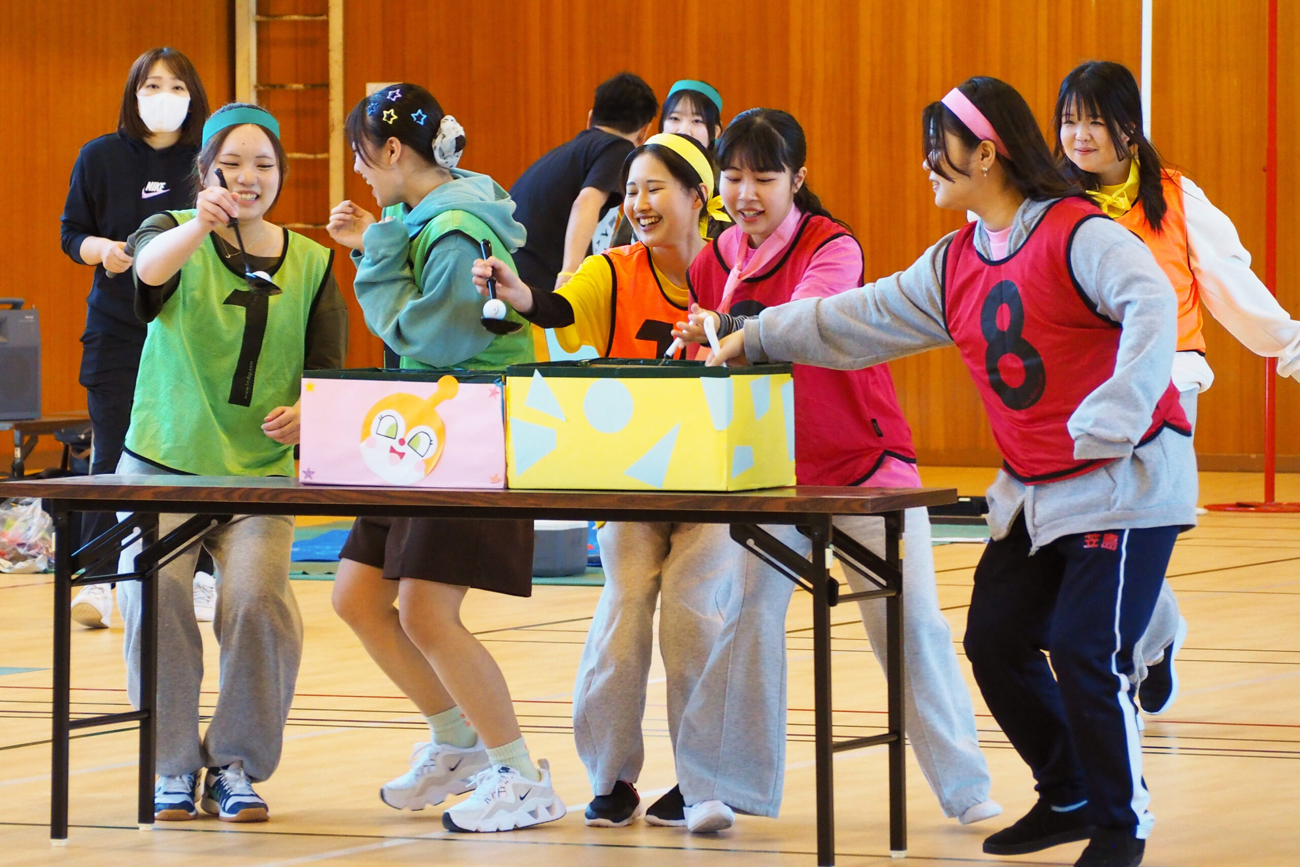 こども分野と医療分野、学年ごちゃまぜの黄・ピンク・緑軍に分かれ様々な競技で対決です💪